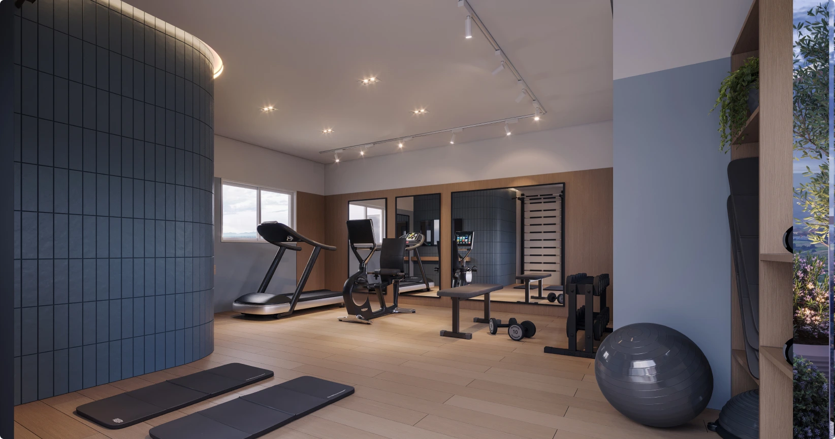 Comodidade, praticidade e bem-estar. Sem trânsito, sem desculpas. Seu treino a poucos passos de você. Um espaço para quem quer cuidar do corpo e da mente, com liberdade de horário.