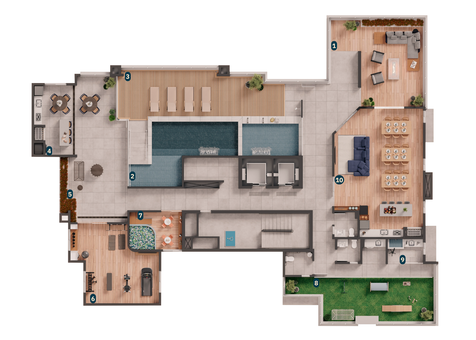 Piscinas aquecidas, com cascata, prainha e deck para banho de sol. Mergulhe onde o horizonte é infinito. A experiência única de relaxar e se refrescar com ótima posição solar o dia todo e com vista panorâmica.